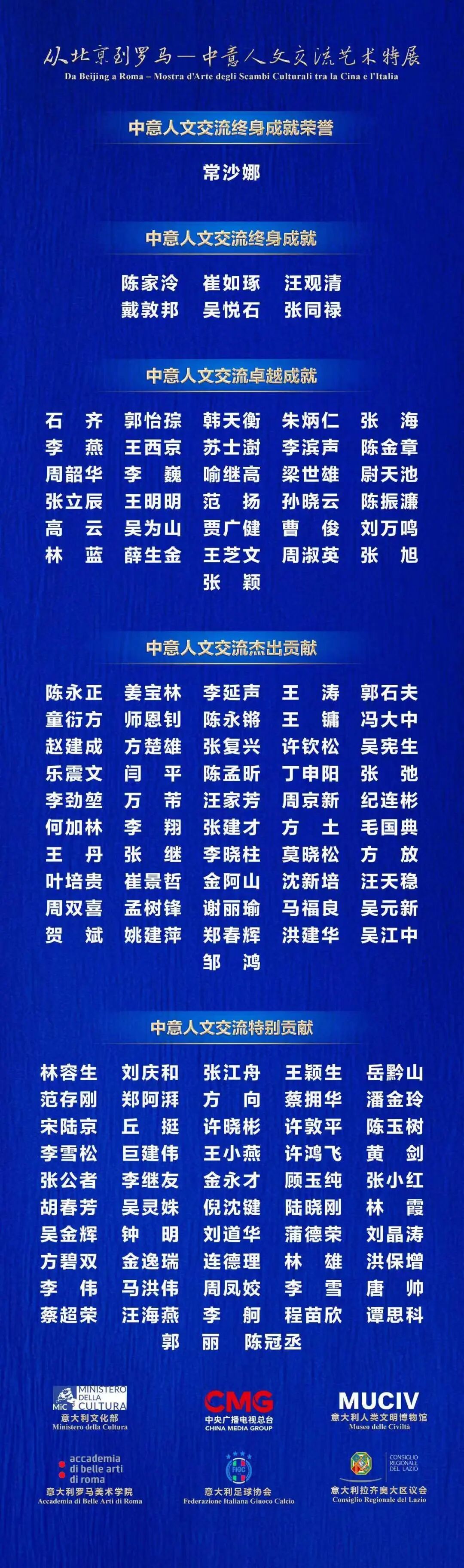 中国文艺志愿者协会副主席、中国美术家协会理事何加林,北京书法家协会副主席方放,国家级非遗代表性项目苏绣国家级代表性传承人姚建萍等获颁“从北京到罗马”——中意人文交流杰出贡献。广州画院院长宋陆京,广州雕塑院院长许鸿飞,国际奥委会奥运艺术大使黄剑,故宫博物院书画临摹组组长、副研究馆员巨建伟,国务院参事室中央文史研究馆创新中心副主任张公者等获颁“从北京到罗马”——中意人文交流特别贡献。